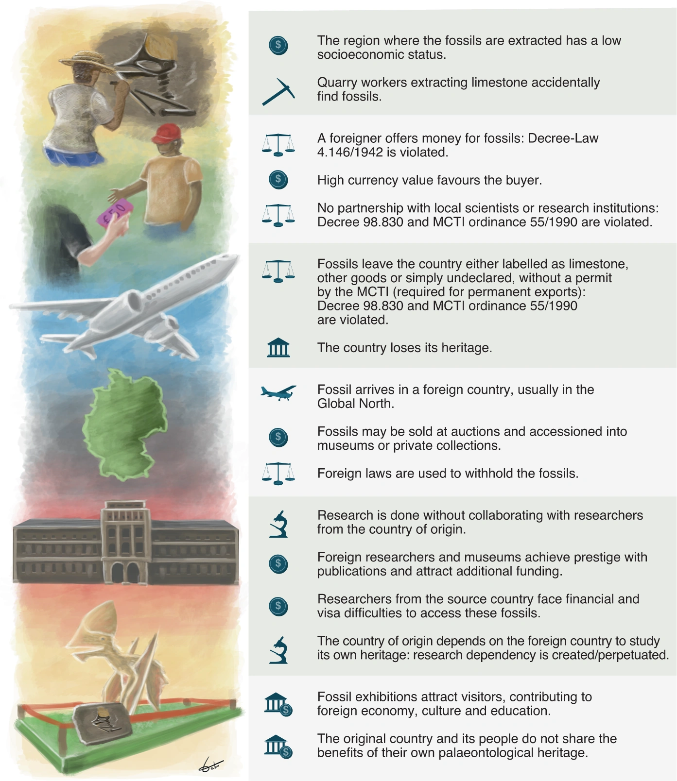 An illustration documenting why illegal fossils should be returned, made for the 2021 Nature article.